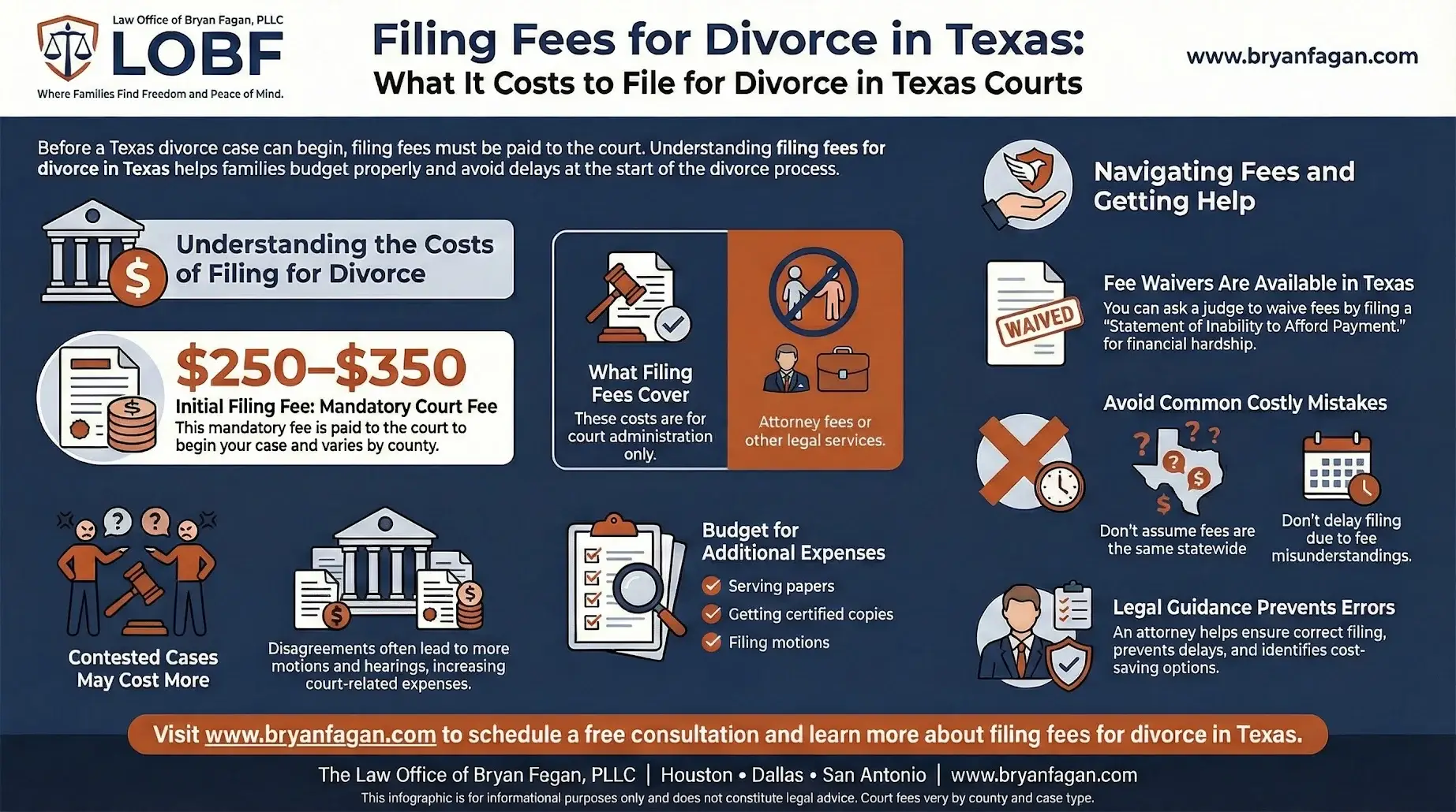 Attorneys at The Law Office of Bryan Fagan, PLLC regularly help clients understand how fee waivers work and how local courts apply these rules in practice. For those filing in the Houston area, our in-depth resource The Truth About Divorce Filing Fees in Harris County, Texas provides helpful county-specific insight. You may also find our broader Texas Divorce Process Guide useful for understanding how court costs, timing, and procedural requirements fit together. Our goal is to educate families, reduce unnecessary stress, and ensure that financial hardship does not become a barrier to protecting your rights and your future.