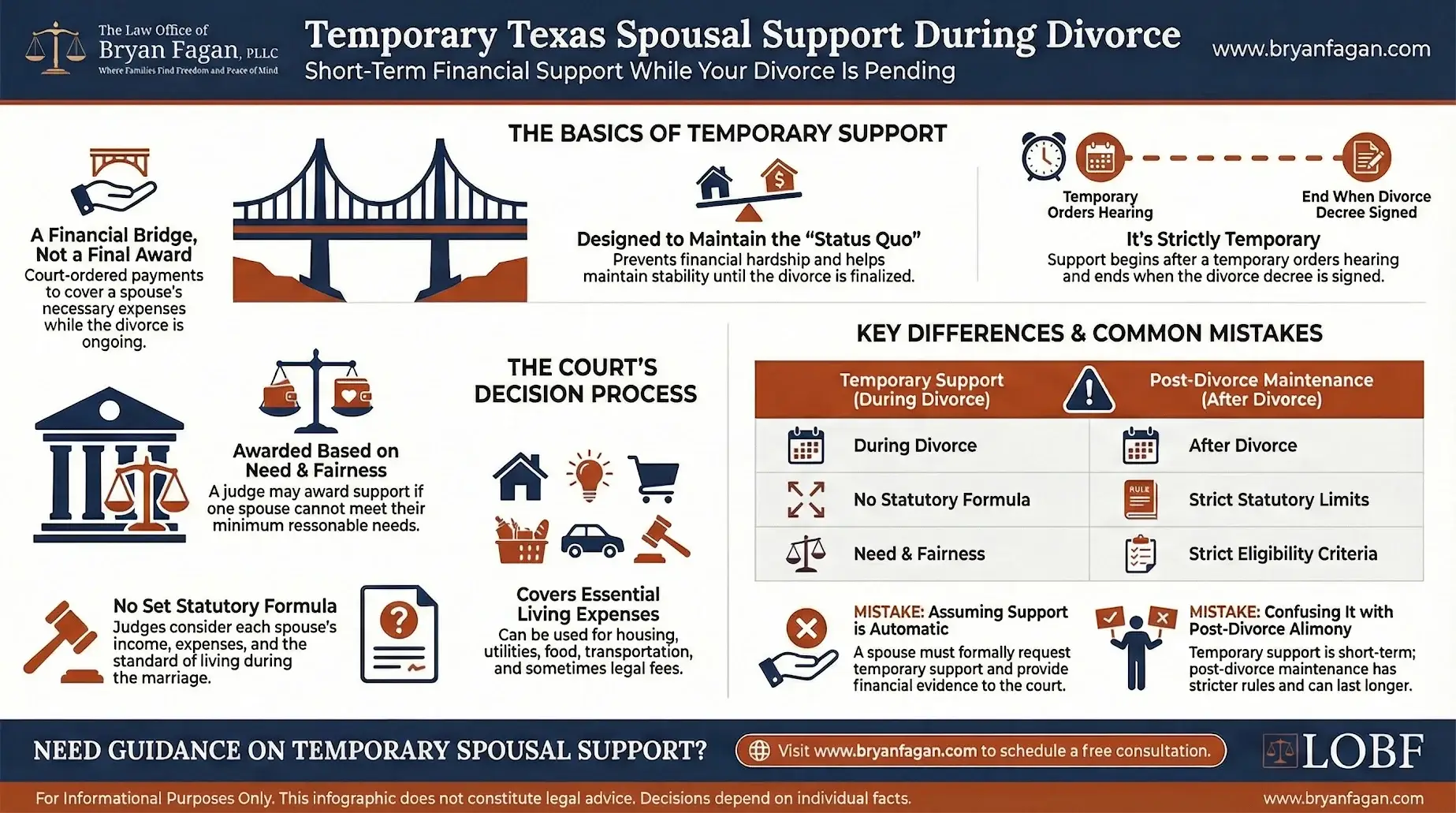 At the Law Office of Bryan Fagan, PLLC, educating families is a core part of protecting their futures. Our attorneys regularly help clients understand how temporary orders fit into the broader divorce process and what courts expect when determining short-term financial support. For additional guidance, families may find it helpful to review our detailed resource on temporary orders in a Texas divorce, which explains how judges apply the Texas Family Code to real-world situations. By combining compassionate client communication with precise legal strategy, our firm remains committed to helping Texas families move forward with clarity and confidence.