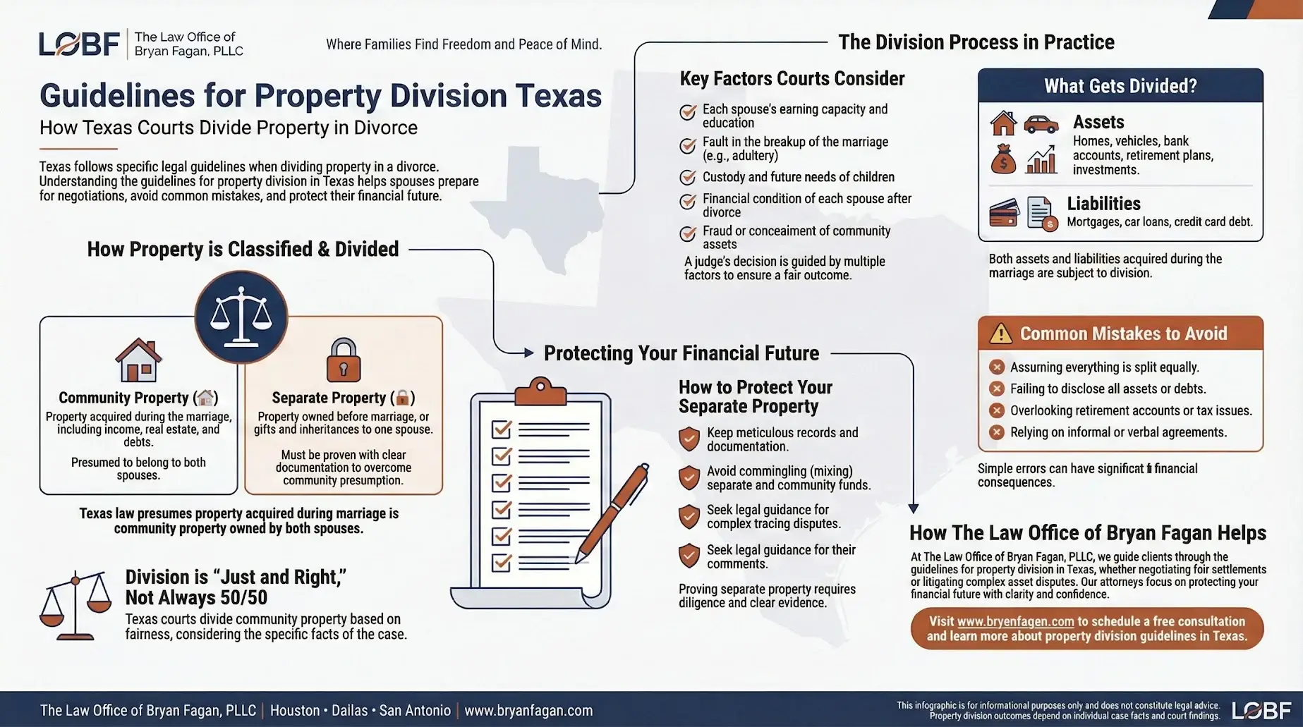 Understanding the Guidelines for Property Division Texas is an important first step, but successful outcomes depend on strategic advocacy and careful planning. Early consultation with a Texas divorce attorney can prevent costly mistakes, such as signing unfavorable agreements or losing separate property claims due to lack of evidence. By combining legal precision with compassionate guidance, the Law Office of Bryan Fagan, PLLC helps families protect their rights, preserve stability, and move forward with confidence and peace of mind.